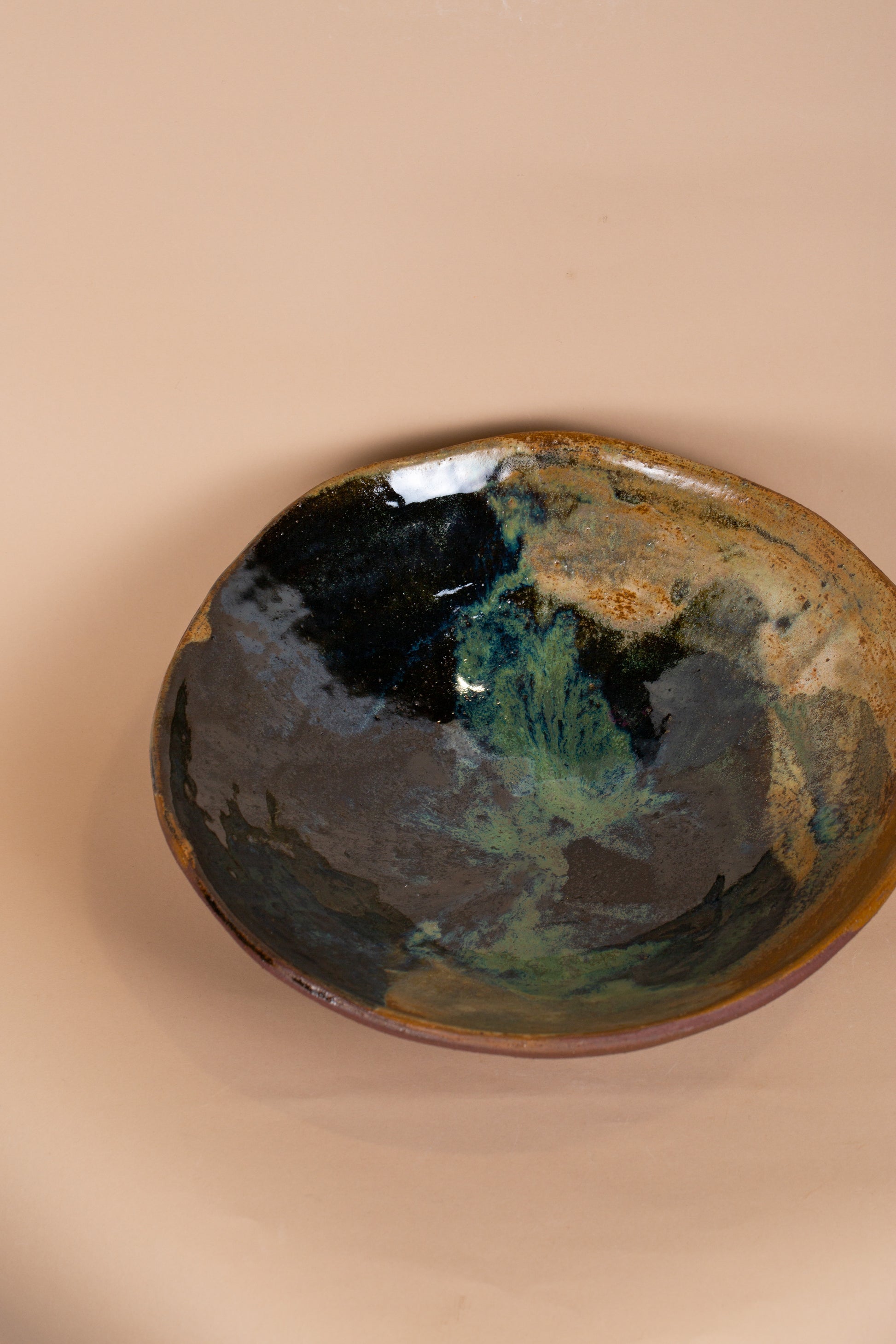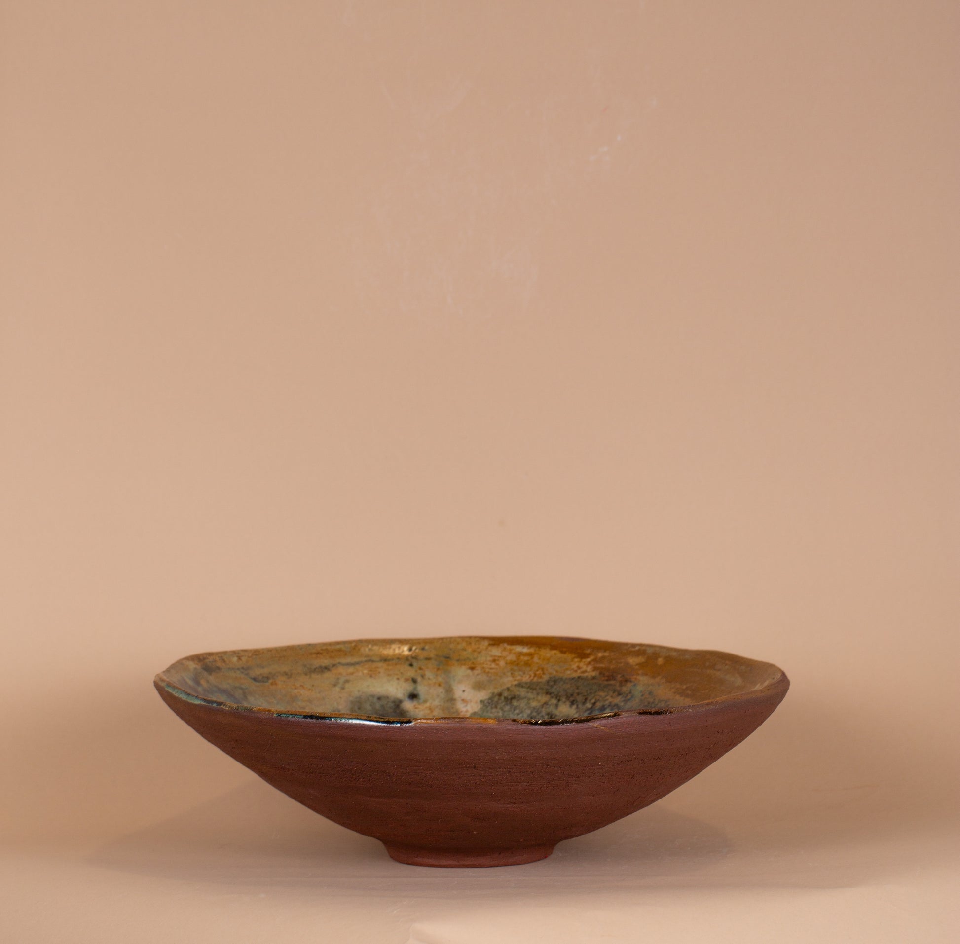 Denne unika skål er skabt i en smuk, varm rød ler, hvor materialets naturlige farve får lov at træde frem. Indersiden er glaseret i et levende, grønligt farvespil, som skaber en smuk kontrast til den rå, uglaserede yderside.
