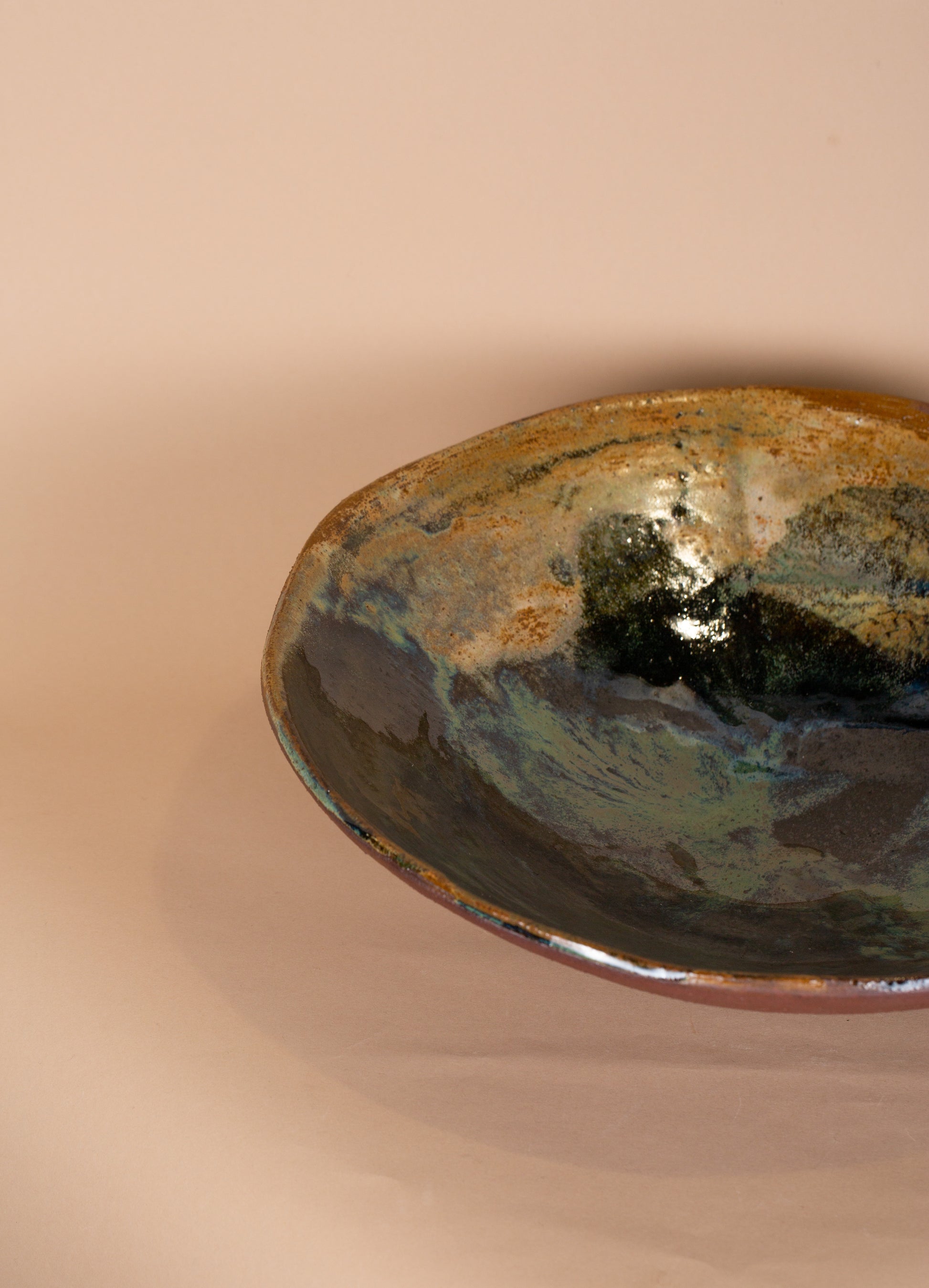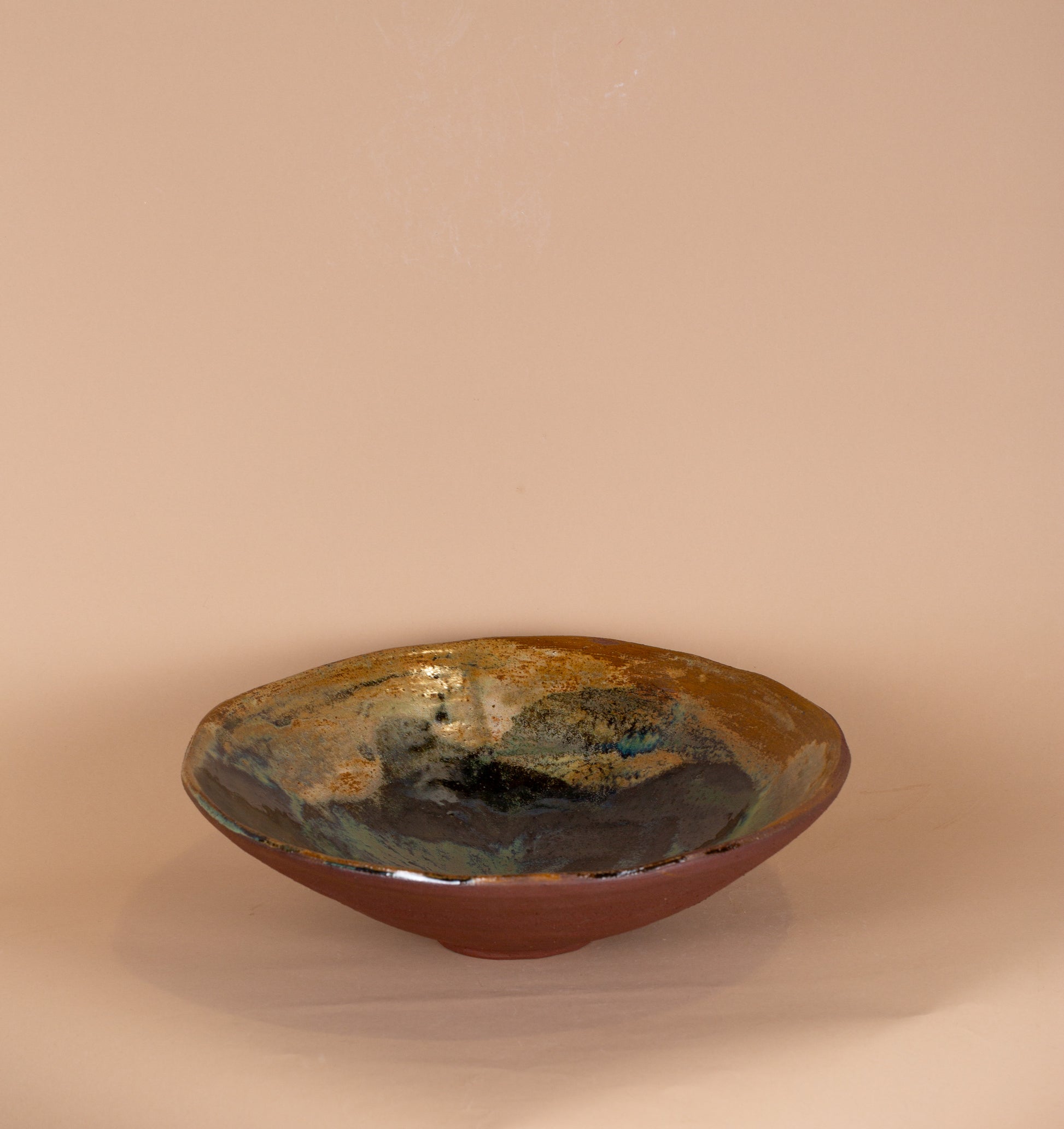 Stor håndlavet skål i varm rødler med grønlig glasur